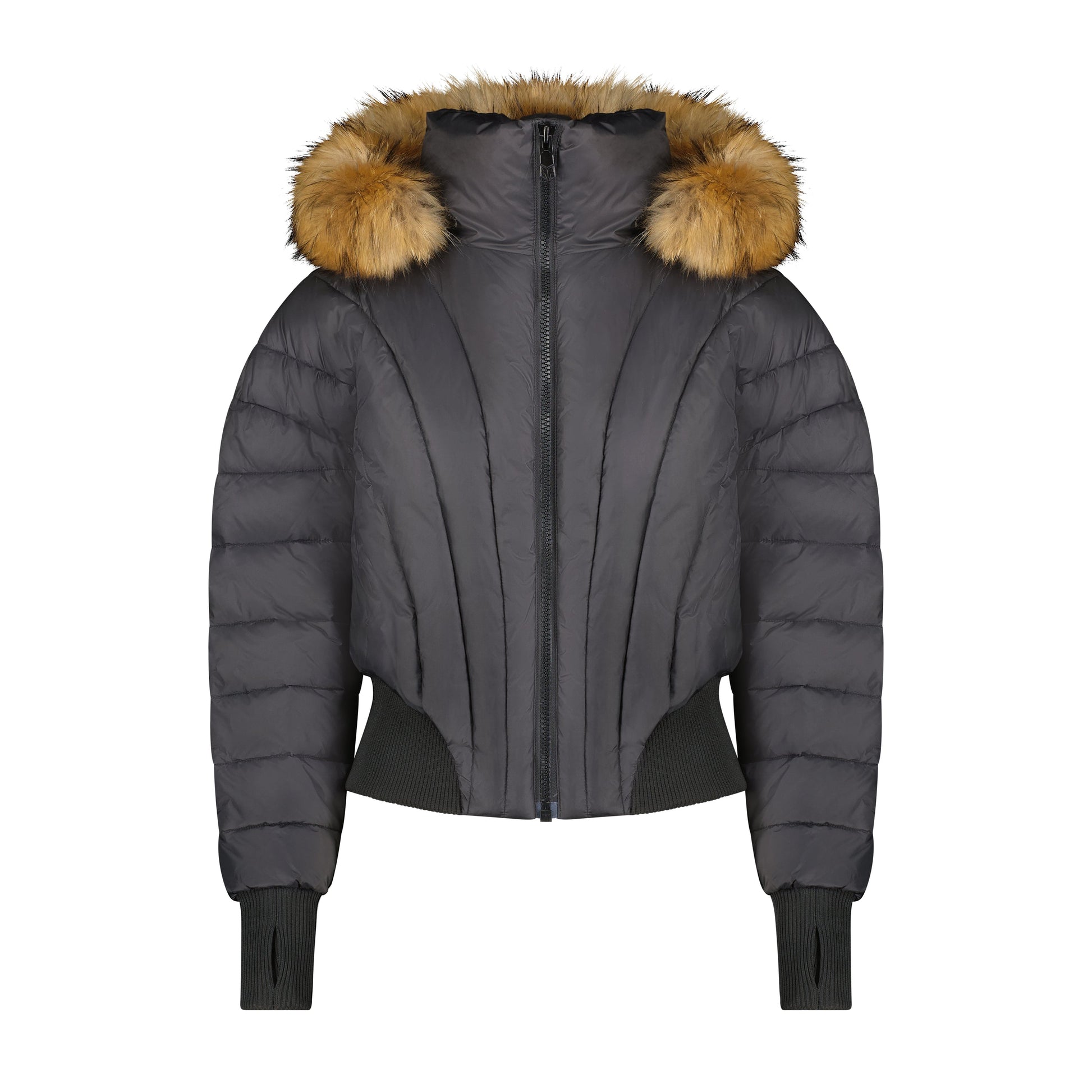 This black teen coat for girls is pure swag, with a short cut, ribbed cuffs, a seashell vibe, and natural fur for that extra touch